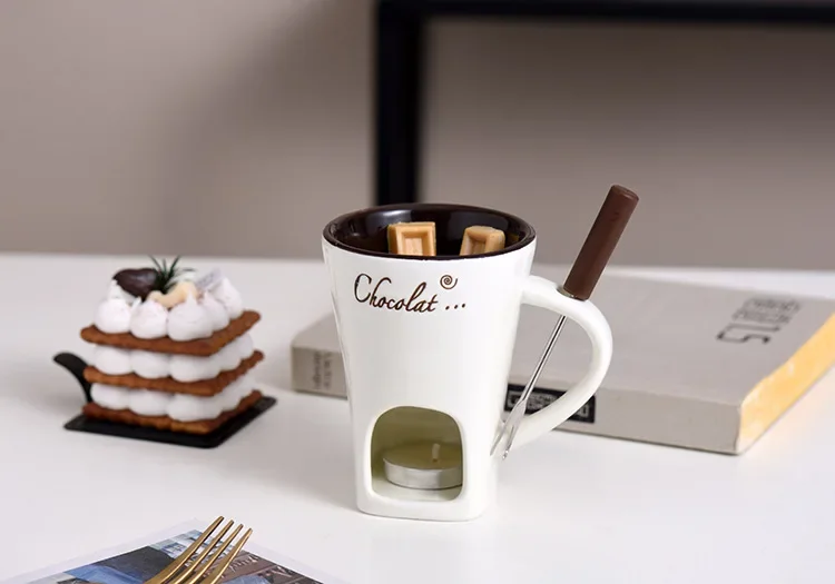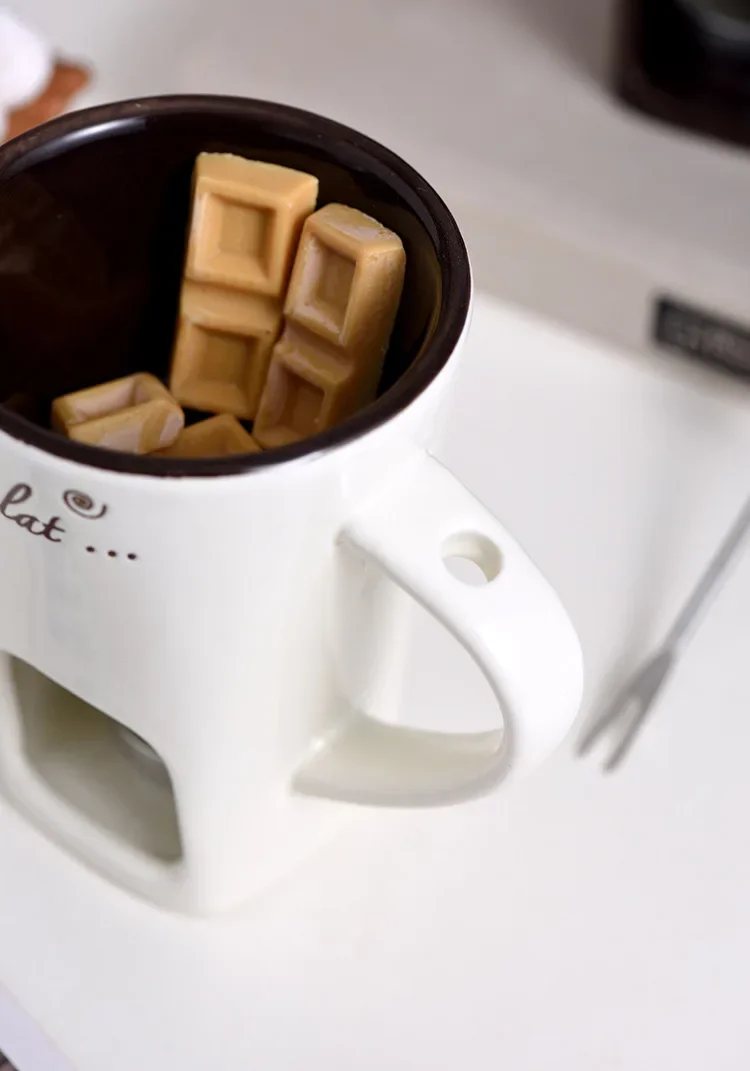 Ceramic Chocolate Cup European Candle Cup Cheese Chocolate Melting Ceramic Mug Heating Food Ceramic Mugwith Fork Creative Mugs