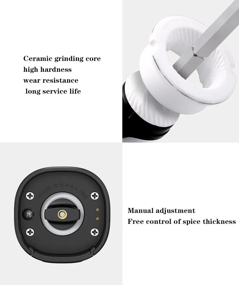 Ceramic grinding core grinds spices more finely and steadily, twist the knob on the bottom of the rechargeable salt mill to set the coarseness you want, and easily control the spice grinding from coarse to ultra-fine. Great for grinding sea salt, black pepper, white pepper and other spices.