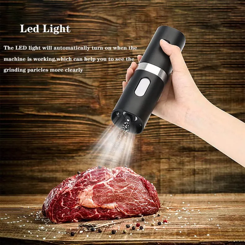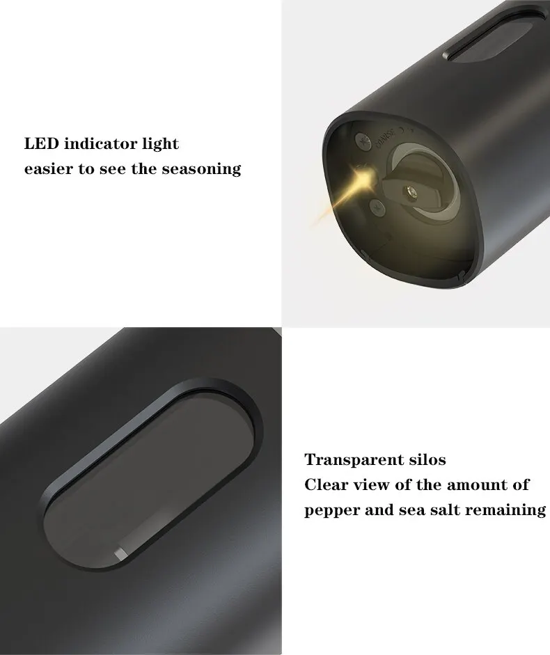 Unique LED light design, there is a blue LED light on the bottom of the grinder. With the LED light, you can easily see not only the amount of salt and pepper added to your food, but also the uniformity of the added area. Low noise design, different from other grinders, those kitchen gadgets is very quiet when working. It won't make a lot of noise.