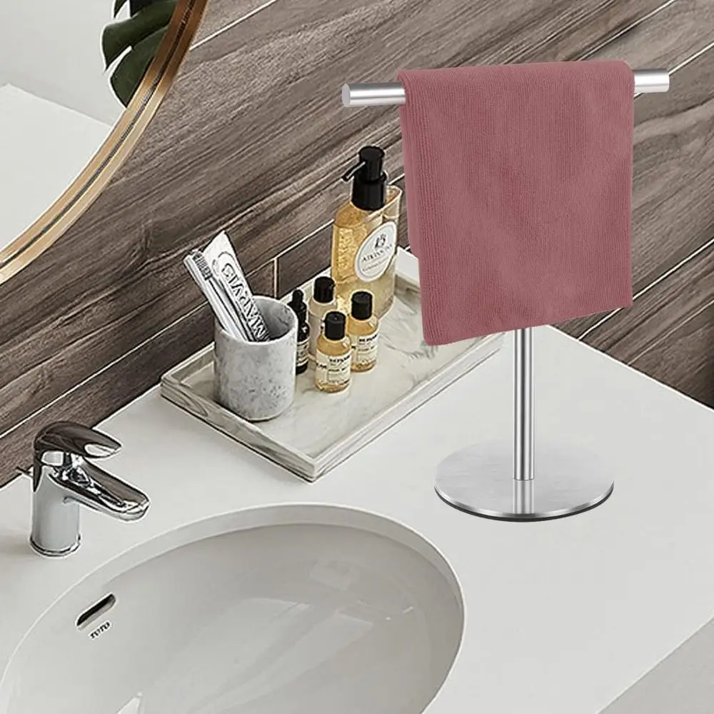 Multi-Functional Hand Towel Holder for Bathroom Countertop: The design of the T-shaped standing towel holder allows for flexible adjustment according to different space requirements. Whether it's a narrow bathroom corner or a spacious bedroom wardrobe, the T-shaped countertop towel holder can find its suitable location. You can use this kitchen hand towel holder in public places such as bathrooms, kitchens, and gyms, which can bring you a good user experience.